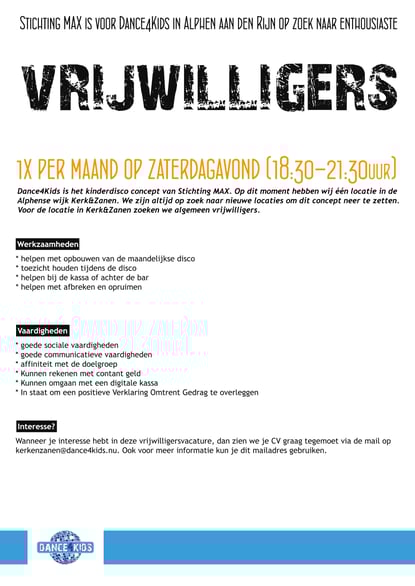 Dance4Kids is het kinderdisco concept van Stichting MAX. Deze Alphense vrijwilligersorganisatie organiseert activiteiten voor tieners en jongeren in Alphen aan den Rijn.